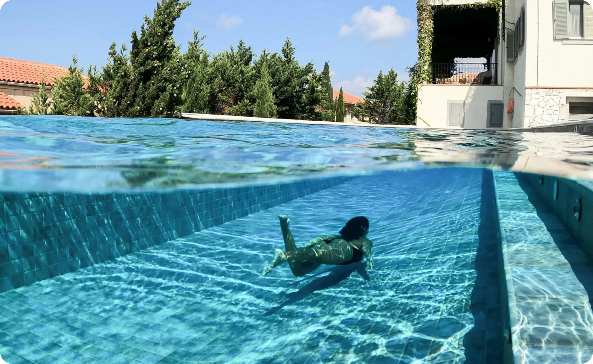 Soukromý nekrytý bazén, který je součástí rodinného domu.