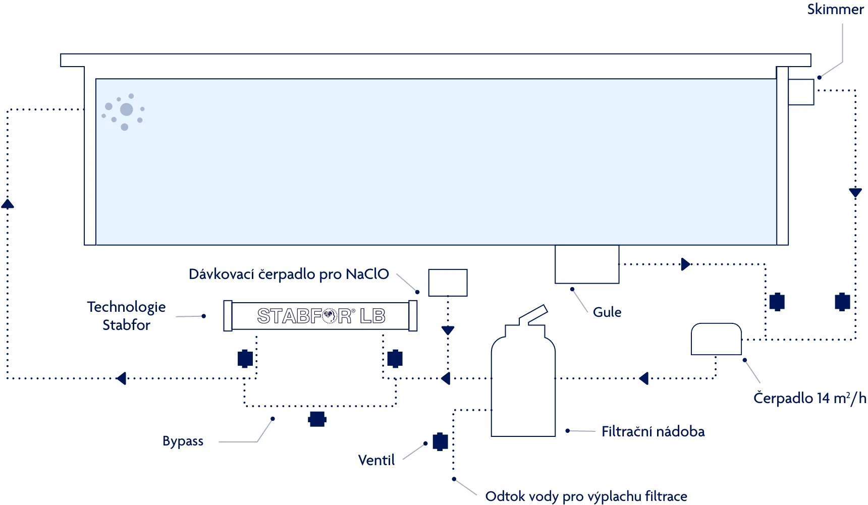 Před jednotku STABFOR® LB se instaluje jednoduchý dávkovač tekutého chlornanu sodného, který po průchodu jednotkou vytváří účinný oxid chloričitý pro čištění vody. Další zařízení (např. pH dávkovače) nejsou potřeba. Jednotka není kompatibilní se slanou vodou – v takovém případě je nutná výměna technologie za standardní dávkovač chlóru.